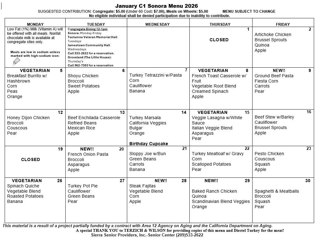 January 2026 Menu